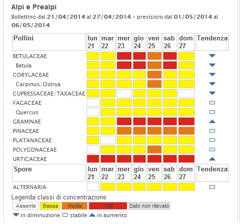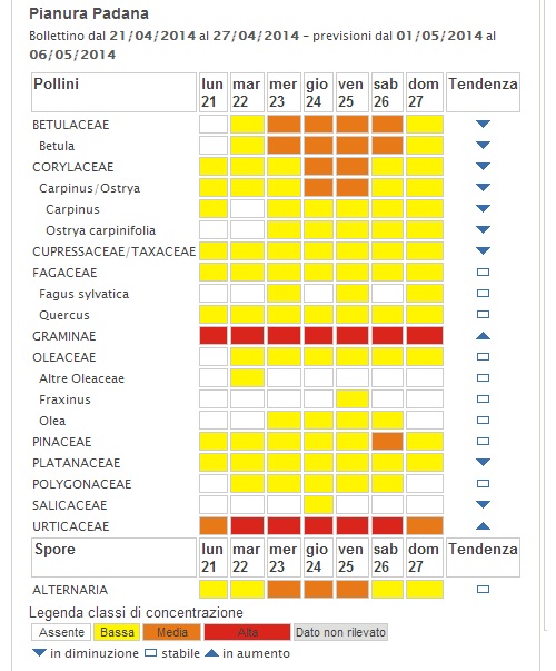 Per gli allergici è un momento difficile, vediamo le previsioni del bollettino pollinico della settimana de Ilpolline.it per le giornate da oggi, primo maggio 2014, fino al 6 maggio. Nella zona Alpi e Prealpi abbiamo, da un lato, un calo della concentrazione di pollini nell’aria di betulaceae (ora a bassa, media o anche alta a seconda delle giornate), di corylaceae (al momento bassa), e di cupressaceae e taxaceae (al momento bassa oppure del tutto assente); dall’altro abbiamo un aumento per i pollini delle temutissime graminae, che si troveranno a concentrazioni anche alte nei prossimi giorni, e di urticaceae, già ora a concentrazioni alte.
