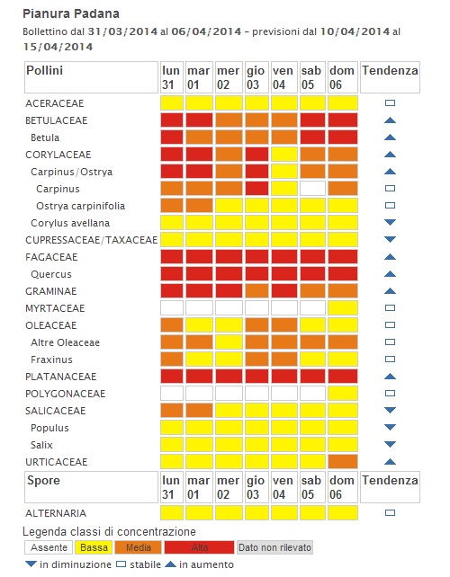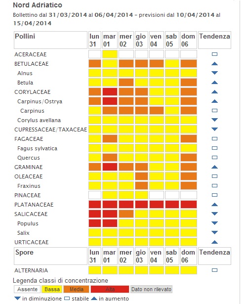 Per il Nord Adriatico si segnala l’alta concentrazione di pollini di platanaceae, ancora in aumento nei prossimi giorni, nonché l’aumento dei pollini di corylaceae e betulaceae, al momento a concentrazioni medio basse. Si segnala la prima, sporadica comparsa in questi giorni di pollini di aceraceae, nonché il persistere a basse concentrazioni (con alcune giornate a concentrazioni medie) di pollini nell’aria di fagaceae; attenzione infine alle spore di alternaria, che si sono registrate a basse concentrazioni da lunedì 31 marzo a domenica 6 aprile 2014, e che dovrebbero restare stabili anche per i prossimi giorni.