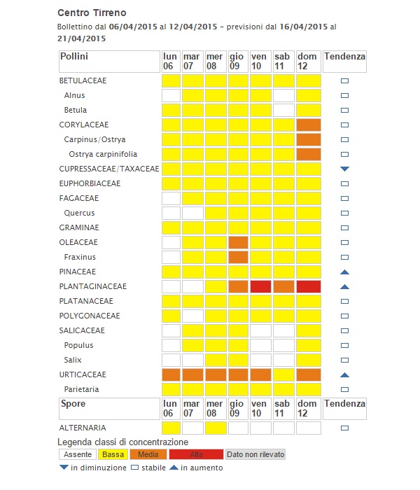 Bollettino pollini aprile 2015, le concentrazioni nel Centro Italia dal 16 al 21