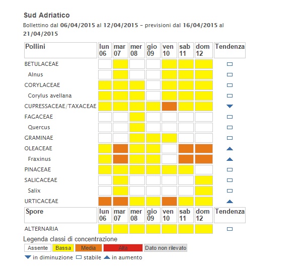 Il bollettino pollinico per il Sud Adriatico, area comprendente la Puglia, rileva in aumento i pollini di oleaceae e urticaceae, prevedibili a concentrazioni più medie che basse nei prossimi giorni. Si segnala inoltre il persistere a basse concentrazioni di spore di alternaria. Non sono pervenuti dati per la zona del Sud Tirreno (Calabria) e per la Sicilia. In Sardegna invece attenzione ai pollini di oleaceae, già presenti a medie concentrazioni e in ulteriore aumento, con i pollini di urticaceae che persisteranno a concentrazioni medio-basse.