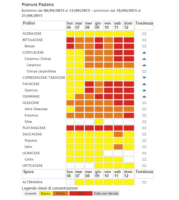 Per chi soffre di allergie in Pianura Padana il bollettino pollinico prevede una situazione ancora più difficile: concentrazioni medio alte, in ulteriore aumento, per i pollini di graminae, oleaceae, fagaceae e corylaceae, con i pollini di betulaceae che si manterranno a propria volta a concentrazioni medio alte e quelli di platanaceae a concentrazioni alte tutti i giorni.