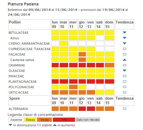 Per quanto concerne chi soffre di allergie nella zona della Pianura Padana, i dati del bollettino pollinico prevedono ancora una persistenza ad alte concentrazioni tanto delle graminae quanto delle plantaginaceae (e concentrazioni medio alte di spore di alternaria). A concentrazioni medio basse troviamo ancora i pollini delle urticaceae, mentre diminuiscono quelli delle betulaceae e delle oleaceae, e sono sul punto di scomparire del tutto quelli delle cheno amaranthaceae.