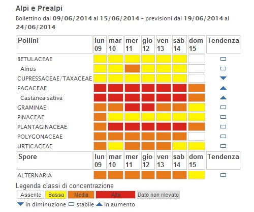 Il bollettino pollinico della settimana de Ilpolline.it prevede, per i giorni dal 19 al 24 giugno 2014, per la zona di Alpi e Prealpi, concentrazioni alte di pollini nell’aria per quanto riguarda le fagaceae (con ulteriore aumento rispetto alla settimana precedente. Persistono a concentrazioni medie o alte i pollini di graminae e plantaginaceae, nonché, a concentrazioni medie o basse, i pollini di urticaceae e polygonaceae e le spore di alternaria, mentre calano ancora i livelli dei pollini di cupressaceae e taxaceae.