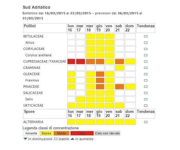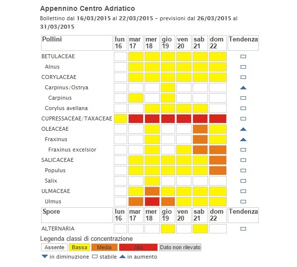 Il bollettino pollinico per i prossimi giorni di marzo prevede invece, per l’area della Pianura Padana una situazione sostanzialmente stabile: nei prossimi giorni le concentrazioni di pollini nell’aria non dovrebbero variare, e pertanto si dovrebbero registrare basse concentrazioni di pollini di betulaceae, corylaceae e ulmaceae, e concentrazioni medio-basse (variabili a seconda delle condizioni metereologiche delle singole giornate) di cupressaceae e taxaceae, di oleaceae e salicaceae. Da segnalare che in alcune giornate si registreranno basse concentrazioni anche dei temuti pollini di graminae. Per quanto concerne invece la zona del Nord Adriatico il bollettino dei pollini di fine marzo prevede un aumento di pollini di oleaceae, e pollini di salicaceae che si manterranno a concentrazioni medie. Concentrazioni basse ma costanti nei prossimi giorni sono previste nella zona per i pollini di acearaceae; si segnala inoltre la presenza a giorni alterni di spore di alternaria a basse concentrazioni. Nell’area del Nord Tirreno per chi soffre di allergie attenzione ai pollini di cupressaceae e taxaceae, previsti a concentrazioni medie nei prossimi giorni, con pollini di betulaceae e corylaceae a concentrazioni basse.