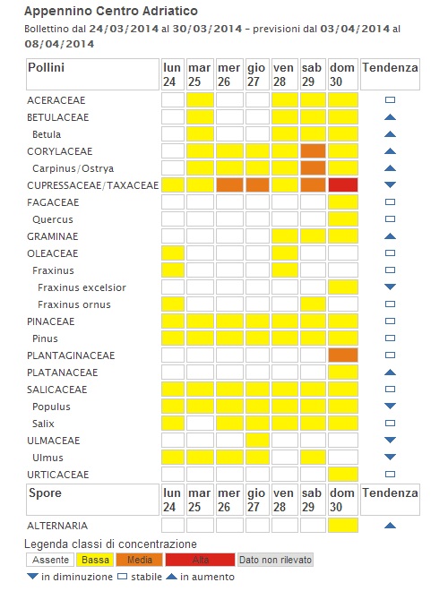 Per quanto riguarda la zona dell’Appennino Centro Adriatico l’ultimo bollettino pollinico stima una decrescita della concentrazione di pollini di cupressaceae e taxaceae, un aumento delle concentrazioni di pollini di corylaceae (ora basse) e di graminae (ora basse o nulle, a seconda delle giornate).