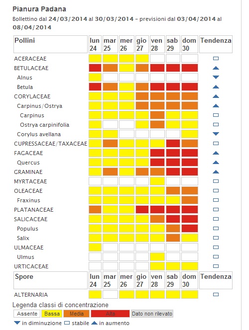 Aggiornamenti per chi soffre di allergie, vediamo, tramite l’ultimo bollettino pollinico, le previsioni della settimana, più precisamente le concentrazioni di pollini nell’aria che si stimano, per le varie piante e le varie zone di Italia, nelle giornate dal 3 all’8 aprile 2014.