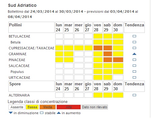 Per la Sardegna il bollettino pollinico per le giornate dal 3 all’8 aprile 2014 vede, in particolare, il persistere a concentrazioni basse o medie dei pollini di cupressaceae taxaceae e di urticaceae, mentre nella zona del Sud Adriatico si segnala il persistere a concentrazioni medio basse dei pollini di pinaceae e un lieve aumento (concentrazioni basse o medie) dei pollini di graminae, nonché il persistere a basse concentrazioni (ma non in tutte le giornate) dei pollini di betulaceae (e di betula in particolare) di cupressaceae taxaceae, di salicaceae (popolus in particolare) e di urticaceae.