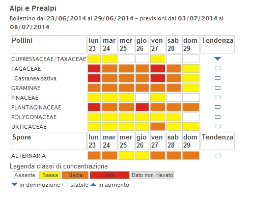 Per chi soffre di allergie, ecco le previsioni del bollettino pollinico di questa settimana de Ilpolline.it: per la zona di Alpi e Prealpi, per le giornate dal 3 all’8 luglio 2014, troviamo un calo delle cupressaceae e taxaceae, ormai assenti in diverse giornate; restano stabili, invece, i pollini di fagaceae e graminae a concentrazioni medie, mentre si prevede la presenza di pollini di plantaginaceae a concentrazioni medio alte. I pollini di urticaceae e polygonaceae saranno presenti nell’aria in concentrazioni basse, mentre a seconda delle giornate la concentrazione per le spore di alternaria potrà risultare anche media.
