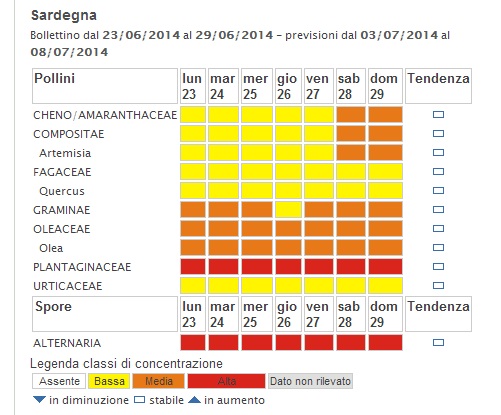 In Sardegna situazione difficile per alcuni allergici: presenza media dei pollini di graminae e oleaceae, ma soprattutto presenza ad alte concentrazioni, probabilmente in tutte le prossime giornate, dei pollini di plantaginaceae e delle spore di alternaria. Il bollettino pollinico per i prossimi giorni di luglio 2014 mette in guardia, per chi vive nella zona del Sud Adriatico, in particolare contro le spore di alternaria, presenti ad alte concentrazioni nell’aria. Persistono comunque, anche se a concentrazioni basse, i pollini di graminae, urticaceae e oleaceae.