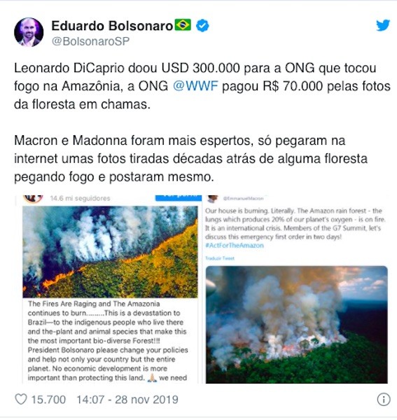 Leonardo DiCaprio ha donato 300.000 USD alla ONG che ha dato fuoco all’Amazzonia, il @WWF ha pagato $ 70.000 per le foto della foresta in fiamme. Macron e Madonna erano più intelligenti, hanno appena preso alcune foto scattate decenni fa di una foresta in fiamme su Internet e le hanno pubblicate.