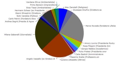 Pochi voti, ma non per questo meno importanti, per le altre personalità in lizza per il premio, che ricordiamo avere puro valore simbolico: Andrea Segrè, preside di Agraria all’università di Bologna, ha raccolto 35 preferenze; Carlo Petrini, fondatore di Slow Food 39; Gianni Silvestrini, Direttore scientifico Kyoto Club, 15 voti; Hermann Scheer, ex presidente del World Council for Renewable Energy, 2 preferenze; Enzo Tiezzi, ambientalista, 56 voti; Primo Barzoni, imprenditore, 20 preferenze; Vandana Shiva, ambientalista, 68; Alex Zanotelli, religioso, 171; Giuseppe Onufrio, Direttore Esecutivo Greenpeace Italia, 122; Amory Lovins, presidente Rocky Mountains Institute, 2 voti; Rosa Filippini, presidente Amici della Terra Italia, 15; Giorgio Nebbia, accademico, 99 voti; Fulco Pratesi, presidente onorario WWF Italia, 27; Catia Bastioli, amministratore delegato Novamont, 69; Massimo Scalia, professore universitario – La Sapienza, 26; Luciana Littizzetto, attrice, 16 voti.
