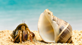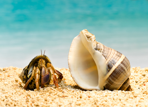 Hermit crab looking at larger shell