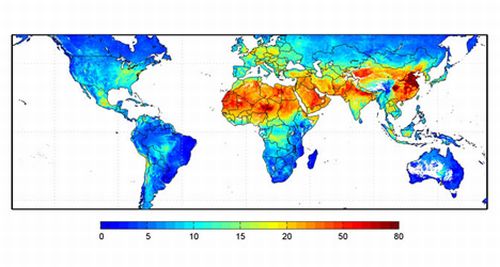 In ogni caso si può vedere come l’area rossa, dunque quella più inquinata, sia quella del Nord Africa, a causa dell’azione dei venti che trasportano gran parte dell’inquinamento europeo in aree in cui, a causa dei deserti, le particelle si fermano e ammorbano l’aria. Discorso simile per India e Asia orientale.