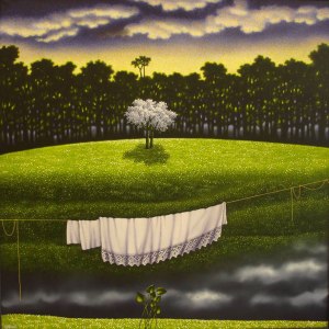 I paesaggi idealizzati da Mottinelli sono realizzati con colori acrilici su tela, sono le sue visioni dalla finestra, paesaggi rurali con panni stesi al sole ad asciugare, tranche de vie del vivere quotidiano. L’artista viene difinito da Celli, curatore della mostra, “surrealista per eccesso di realtà” per lo zelo con cui rappresenta il paesaggio che lo circonda, un paesaggio tuttavia idealizzato attraverso i suoi ricordi, e la continua sensazione di silenzio, di attesa, come se la natura da un momento all’altro potesse urlare, ribellarsi, forse per come l’uomo danneggia e annienta la sua vita.