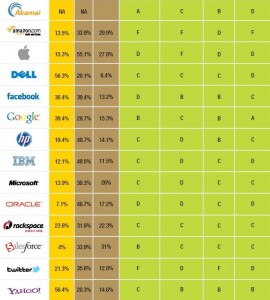 Ottimo punteggio anche per Dell che ottiene solo 0,1% in meno rispetto a Yahoo e che utilizza molto poco il nucleare, appena il 6,4%, ma molto poco anche le rinnovabili, ottenendo un punteggio di D. Alla base del podio troviamo Google che, si sa, è l’azienda che più di tutte sfrutta le rinnovabili (è l’unica ad ottenere il punteggio A), ma il mix carbone più nucleare arriva quasi al 50% dell’energia utilizzata.
