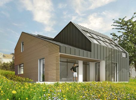 Questa casa ha la particolarità di combinare il comfort e l’efficienza energetica attraverso un uso sapiente del tetto spiovente. Il concetto architettonico costruito attorno alle variazioni del tetto moltiplica le potenzialità di sfruttamento del sole riempiendo gli ambienti di vita di energia positiva. L’aria e la luce sono studiate in modo da garantire benefici per la salute, spazi areati, luminosi e salubri, tanto genuini e naturali quanto poco artificiali. I pannelli fotovoltaici sono integrati nel tetto e tutto, nella costruzione, è progettato in funzione di ariosità e luminosità.