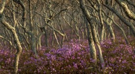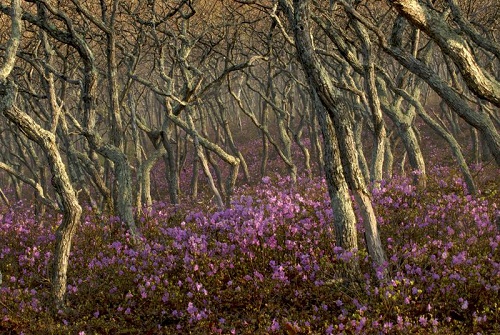 Spring in the taiga, Lazorskiy Reserve, Primorye Region in the Southeast of Russia. Forest with pink flowers on the ground.