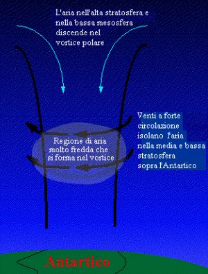 d’aria fredda che in primavera vengono a scontrarsi con le correnti d’aria cariche di ozono provenienti dalle zone tropicali dove l’ozono si forma a seguito di reazioni chimiche provocate dai raggi solari, lì più intensi; disperdendo l’ozono nella stratosfera durante i mesi di luce. Nel Polo Sud il buco dell’ozono è più intenso che al Polo Nord perché mentre nell’Antartide il vortice polare è più freddo e più intenso in