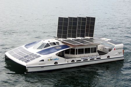 sperimentata in un lago del Regno Unito. L’Amburgo Solar Shuttle (a sinistra) è stata costruita nel 2000 e può trasportare fino a 120 passeggeri. La sua lunghezza è di 42 metri e la velocità massima è di 15 km/h. La Costance solar shuttle (a destra) opera sul lago di Costanza, vicino al confine tra Germania, Austria e Svizzera. Essa trasporta fino a 60 passeggeri ad una velocità di 15 km/h e la sua lunghezza è di 20 metri. Ma le navi ecologiche possono anche essere private.