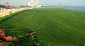 A view shows an algae covered public beach in Qingdao, northeast China’s Shandong province on July 4, 2013. The seas off China have been hit by their largest ever growth of algae, ocean officials said, with vast waves of green growth washing onto the shores of the Yellow Sea. CHINA OUT AFP PHOTO (Photo credit should read STR/AFP/Getty Images)