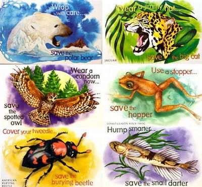 Negli States il Center for Biological Diversity distribuirà gratuitamente 350 mila preservativi con sulla scatola immagini di animali in via d’estinzione, con messaggi per ricordare che la Terra è in pericolo, e all’interno delle confezioni anche informazioni sui problemi derivanti dalla sovrappopolazione.