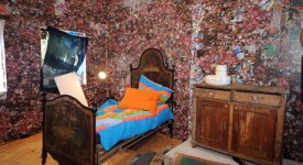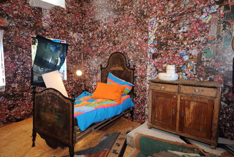 Un particolare dell’ interno di una stanza del prototipo di eco-hotel, il Corona Save The Beach Hotel, allestito in quattro giorni nei giardini antistanti Castel Sant’Angelo, nel cuore della capitale, il tetto costituito da 200 mq di prato artificiale, e pareti con un milione di pezzi di scarto – tra manichini, giocattoli, e bottiglie di plastica – provenienti da diversi Paesi europei, e in parte da spiagge. Per un totale di 12 tonnellate di rifiuti organici che andranno a costituire la struttura realizzata dallo studio dell’architetto tedesco Shult. L’hotel e’ alto 8 metri, lungo 12 e largo 10 ed e’ diviso in 80 pannelli, inaugurato oggi durante la settimana in cui si festeggia la Giornata Mondiale dell’Ambiente (5 giugno). ANSA/CLAUDIO ONORATI/on