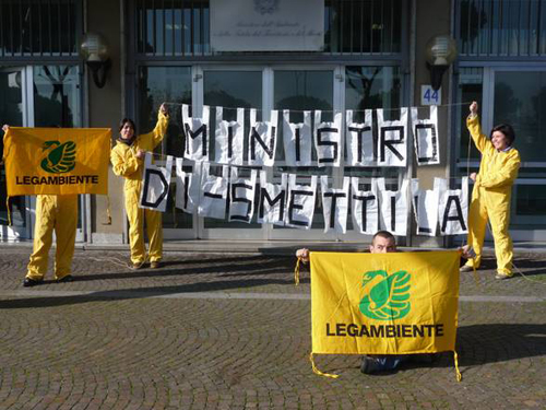 ”Ministro di-smettila’‘ inneggia lo slogan scritto a caratteri cubitali su un insolito striscione fatto di sacchetti di plastica. Con questo espediente comunicativo Legambiente ha organizzato il suo blitz davanti al Ministero dell’Ambiente per chiedere a Stefania Prestigiacomo di non indugiare più nell’incertezza sull’abbandono della plastica ed attendere alle disposizioni comunitarie decretando la messa al bando effettiva dei sacchetti di plastica a partire dal gennaio 2011.
