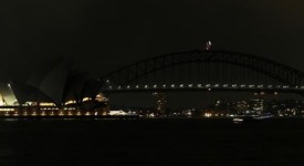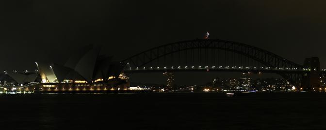 The Sydney Opera House, left, and the Harbour Bridge have their lights that usually have structures well lit at night turned off in Sydney, Saturday, March 27, 2010, as part of Earth Hour. Millions of people in more than 100 countries are expected to dim the lights in what has become an annual gesture against global warming. (AP Photo/Rick Rycroft)