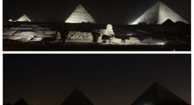 A combination of pictures shows the great Giza pyramids and the Sphinx before (top) and during Earth Hour in Cairo March 27, 2010. Earth Hour, when everyone around the world is asked to turn off lights for an hour from 8.30 p.m. local time, is meant as a show of support for tougher action to confront climate change . REUTERS/Amr Abdallah Dalsh (EGYPT – Tags: CITYSCAPE ENVIRONMENT SOCIETY IMAGES OF THE DAY)