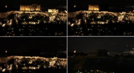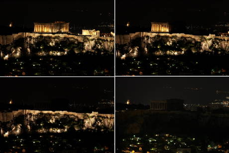 epa02095766 A composite picture shows the hill of the Acropolis before and during Earth Hour in Athens, Greece, 27 March 2010. Several countries around the World have signed up for Earth Hour, during which homes, offices and landmarks will turn off their lights briefly, to raise awareness about climate change and the threat from rising greenhouse gas emissions. EPA/PANTELIS SAITAS