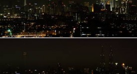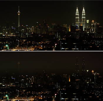 epa02094984 A composite picture shows Malaysia’s landmark, the Petronas Twin Towers (R) and the Kuala Lumpur Tower (L) along with other buildings before and after the lights were switched off to mark Earth Hour in Kuala Lumpur, Malaysia, 27 March 2010. Earth Hour is a campaign to encourage businesses, communities and individuals to take the simple steps needed to cut their emissions. EPA/SHAMSHAHRIN SHAMSUDIN