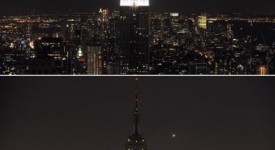 epa02095880 The Empire State Building is seen in a combo photo with its lights on and then off, as part of Earth Hour observations in New York, New York, USA, 27 March 2010. Landmarks as well as hundreds of millions of people, organizations, corporations and governments around the world are turning off their lights for one hour, as part of Earth Hour as a way to draw attention to energy conservation issues. EPA/JUSTIN LANE