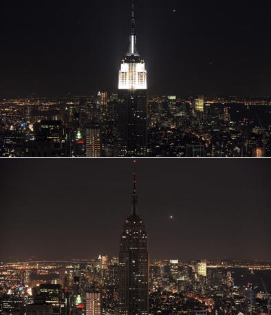 epa02095880 The Empire State Building is seen in a combo photo with its lights on and then off, as part of Earth Hour observations in New York, New York, USA, 27 March 2010. Landmarks as well as hundreds of millions of people, organizations, corporations and governments around the world are turning off their lights for one hour, as part of Earth Hour as a way to draw attention to energy conservation issues. EPA/JUSTIN LANE