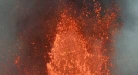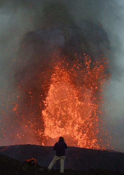 ETNA, ITALY: A photographer shoots pictures of an eruption of lava over the Etna volcano, east Sicily, early 26 July 2001. Villagers living in fear on the slopes of Mount Etna, Europe’s most active volcano, were able to heave a sigh of relief 25 July as lava flows eased before reaching their homes. AFP PHOTO GABRIEL BOUYS (Photo credit should read GABRIEL BOUYS/AFP/Getty Images)