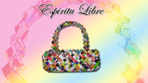 Ora è il turno della linea di accessori Espiritu libre, una vasta gamma di borse, pochette, portafogli, cornici, infradito, realizzati a mano e composti da carte di caramelle, snack e rifiuti cartacei di vario tipo, forma, colore e genere. Il risultato? A giudicare dalla foto, colorato e vivace, sicuramente originale ed in linea con le ultime tendenze che mettono al centro dell’attenzione proprio il rispetto ambientale.