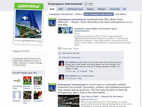 2. Greenpeace e la Campagna per bandire il carbone. Greenpeace usa la sua bacheca per tenere informati amici e fan sugli sviluppi delle sue campagne, le quali si incentrano sulla pesca, l’inquinamento, l’agricoltura, il nucleare, ma soprattutto sul bando totale al carbone. Una delle sue campagne più riuscite è “togli l’amicizia al carbone“, la quale ha attirato più di mezzo milione di sostenitori in tutto il mondo che vogliono una società alimentata dalle energie rinnovabili.
