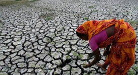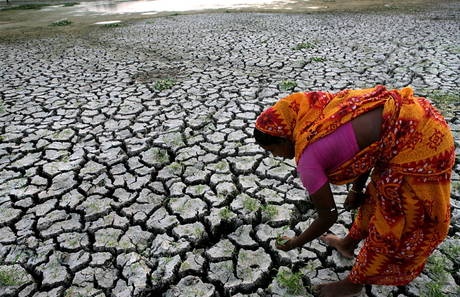 Una donna raccoglie l’erba da un terreno inaridito in un villaggio a 60 km a nord di Calcutta, in una foto d’archivio.