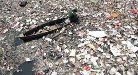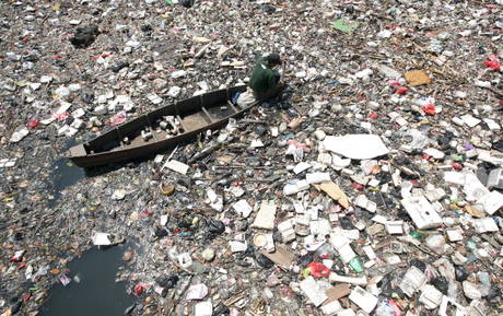 Un indonesiano raccoglie legna in un fume inquinato a Giakarta, in una foto d’archivio.