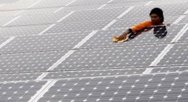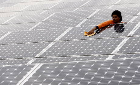 Un uomo pulisce un pannello solare a Singapore, in una foto d’archivio.