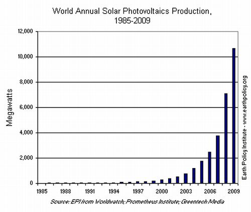 I produttori di celle solari fotovoltaiche hanno prodotto un record di 10.700 megawatt di celle fotovoltaiche a livello mondiale nel 2009, un impressionante aumento del 51% rispetto all’anno precedente. Mentre la crescita nel 2009 รจ rallentata dopo la notevole espansione dell’89% nel 2008, ha continuato la rapida ascesa di un settore rinnovabile che per primo ha raggiunto 1.000 megawatt di produzione nel 2004.
