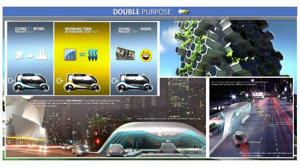 Le città del futuro non saranno più divise in aree funzionali, pensate per le diverse attività che l’uomo compie nella giornata- lavoro, residenza, shopping, relax – ma le funzioni saranno integrate in un luogo mobile che potrà essere l’auto. Le città del futuro saranno costruite ad anelli concentrici con velocità diverse e la mobilità integrata permetterà di coprire le lunghe distanze tra la periferia ed il centro permettendo di compiere diverse attività all’interno dell’auto, una Mobility Lounge che funzionerà da ufficio, da sala relax, da cinema, adatta allo stile di vita urbano.