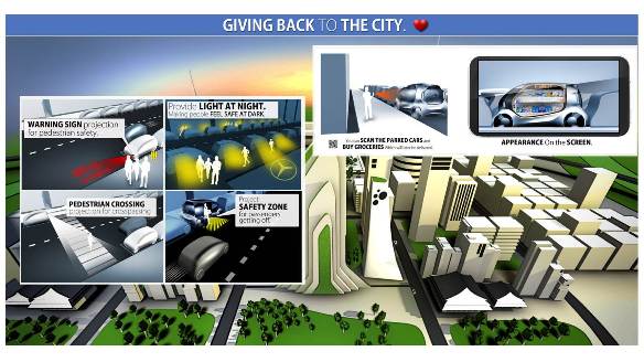 Le auto diventeranno sempre più intelligenti e integrate con la vita della comunità. L’auto del futuro sarà autonoma, non avrà bisogno dell’uomo al volante che potrà sfruttare il tempo nell’auto per compiere azioni diverse e, parcheggiata, servirà come schermo per segnalare notizie ed informazioni, avrà dei sensori che segnaleranno la presenza di un bambino, potrà servire come fonte di illuminazione pubblica nelle ore notturne, sarà in comunicazione con le altre auto, garantendo un maggior livello di sicurezza rispetto al controllo umano.