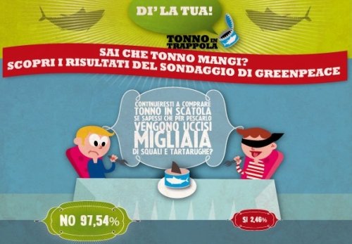 Greenpeace da diverso tempo porta avanti una campagna di sensibilizzazione nell’uso del tonno in scatola, dopo blitz e informazione, l’eminente associazione ambientalista pubblica i risultati del sondaggio “Tonno in scatola”, cominciato 3 mesi fa per scoprire cosa pensano i consumatori della “sostenibilità delle scatolette di tonno vendute in Italia”.