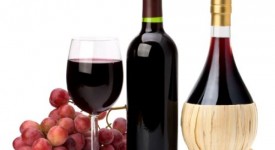 Full red wine glass goblet, bottles and grapes
