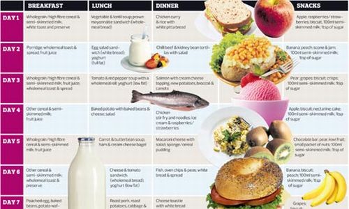 Come noterete dallo schema (per vederlo meglio scaricatelo in PDF), lo stesso piatto non viene mai riproposto due volte nel corso della settimana. Il lunedì, o comunque il primo giorno in cui iniziate la dieta, per la prima colazione si consigliano latte parzialmente scremato con cereali ricchi di fibre, accompagnati da toast integrali e marmellata; a pranzo legumi, il primo piatto suggerito nello specifico è una minestra di lenticchie, per secondo viene proposto un sandwich di scampi e maionese su pane nero; conclude la giornata una cena a base di pollo e riso al curry accompagnato da una fetta di pita.