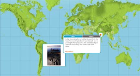 Scorrendo in una zona evidenziata, è possibile aprire una finestra con delle informazioni preliminari e un link per ulteriori informazioni sulle tigri in quel luogo. Il WWF rileva che le tigri selvatiche occupano solo il 7% del loro storico habitat. E con solo poche migliaia di esemplari rimasti, la speranza è che questa mappa e le risorse che collega possa aiutare i governi e le ONG che hanno la forza di farlo, ad ottemperare a degli sforzi di conservazione durante il Global Tiger Summit di Vladivostok che si terrà nel settembre 2010.