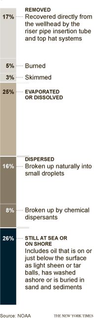 Il piรน grande problema รจ che molti sottovalutano l’impatto che i disperdenti chimici hanno avuto nella rimozione del petrolio. L’AP (Associated Press) ha riferito oggi che i disperdenti sono stati responsabili di un sesto (circa 16%) della scomparsa della fuoriuscita di petrolio nel Golfo, molto piรน delle stime del New York Times, che tende a peccare per eccesso di cautela, che gli ha assegnato solo l’8%.