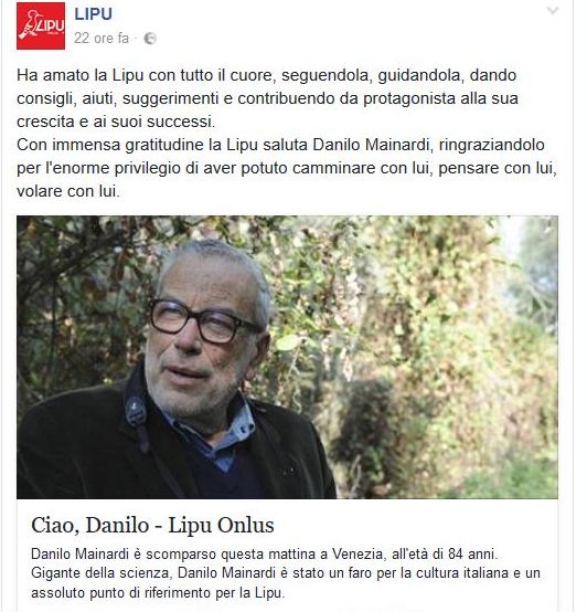 Con immensa gratitudine la Lipu saluta Danilo Mainardi, ringraziandolo per l’enorme privilegio di aver potuto camminare con lui, pensare con lui, volare con lui.