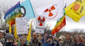 BRIDGWATER, ENGLAND – MARCH 10: Protesters listen to speakers at the gates to the Hinkley Point nuclear power station, as they gather to mark the first anniversary of the Fukushima disaster in Japan, on March 10, 2012 near Bridgwater, England. Protestors planned to blockade the site at Hinkley, which is located on the Bristol Channel and has been earmarked for a potential new nuclear power station, for 24 hours starting today. (Photo by Matt Cardy/Getty Images)