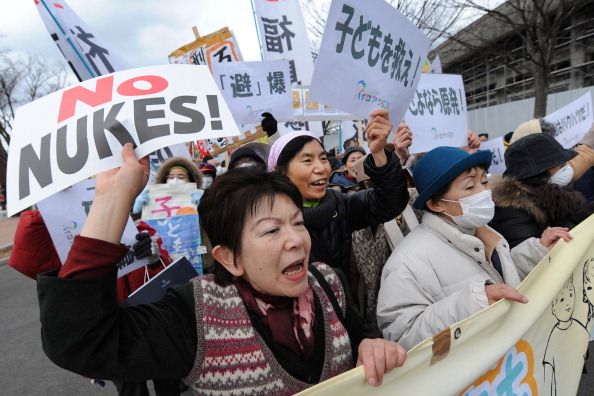 Elderly women shout slogans as they wave banners during a demonstraton denouncing nuclear power plants in Koriyama, Fukushima Prefecture, on March 11, 2012. Some 16,000 people took part in the rally and demonstraion to mark the first anniversary of the earthquake and tsunami disaster. AFP PHOTO/Toru YAMANAKA (Photo credit should read TORU YAMANAKA/AFP/Getty Images)